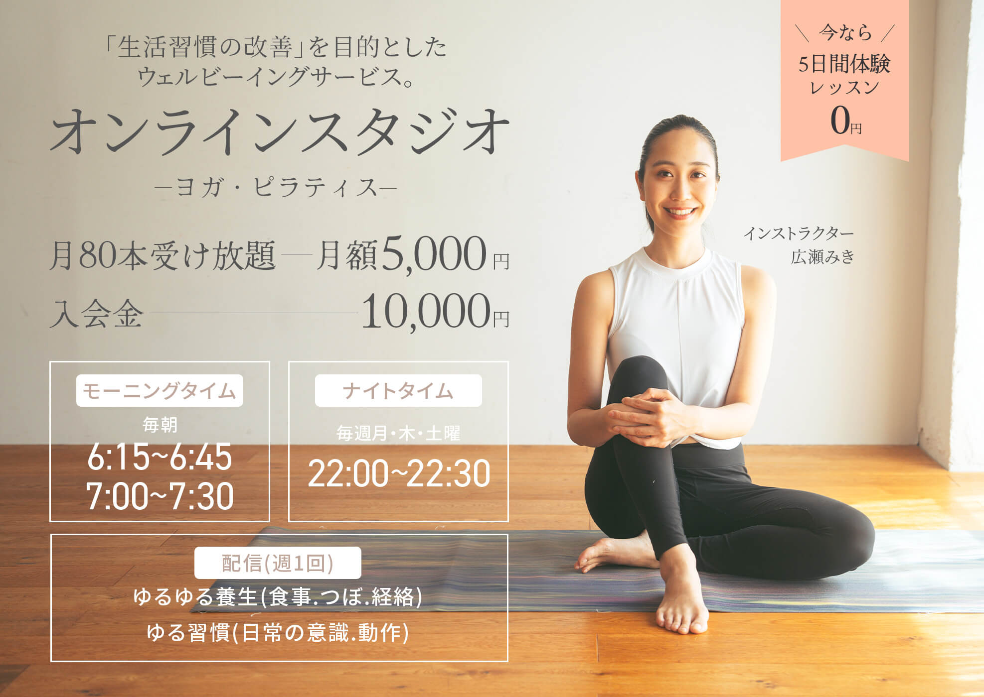 世田谷区太子堂にある、平日限定のヨガ・ピラティス教室です。最大8名までの少人数制で、一人ひとりの身体に合わせた丁寧な指導を行います。