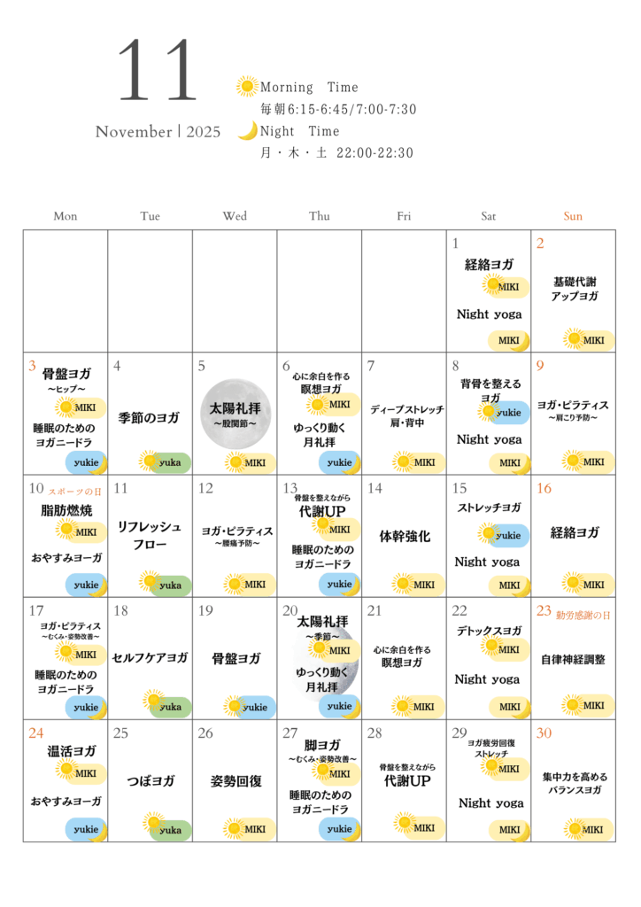 11月スケジュール 2025 11/02 お知らせ 2025年11月2日 お知らせ よかったらシェアしてね! URLをコピーしました! URLをコピーしました! 【会員様限定】10月のゆる習慣・ゆるゆる養生 この記事を書いた人 広瀬みき ヨガ講師|長男出産後、産後クライシスの経験から 365日オンラインスタジオ GLÜCK. (グルック)を立ち上げました。また、目黒区中心に保育園・児童館・子育てサロン・デイサービス・企業向けにてレッスン担当をしています。 関連記事 三軒茶屋にて新規教室開始 2025年9月19日 サービス内容追加および料金変更のお知らせ 2025年3月31日 サービス名変更のお知らせ 2024年4月24日 コメント コメントする コメントをキャンセルコメント ※ 名前 ※ メール ※ サイト 次回のコメントで使用するためブラウザーに自分の名前、メールアドレス、サイトを保存する。 Δ